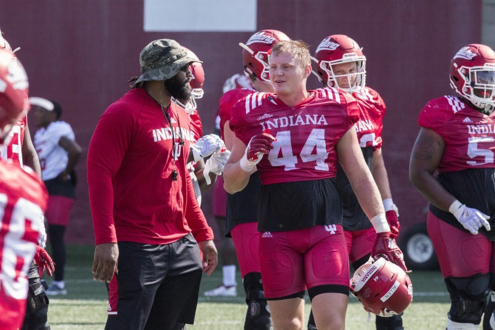 Freshman linebacker Thomas Allen talks with athletic performance coach Paul Constantine during practice Monday morning at the IU Football practice fields. Allen is the son of IU Coach Tom Allen.
