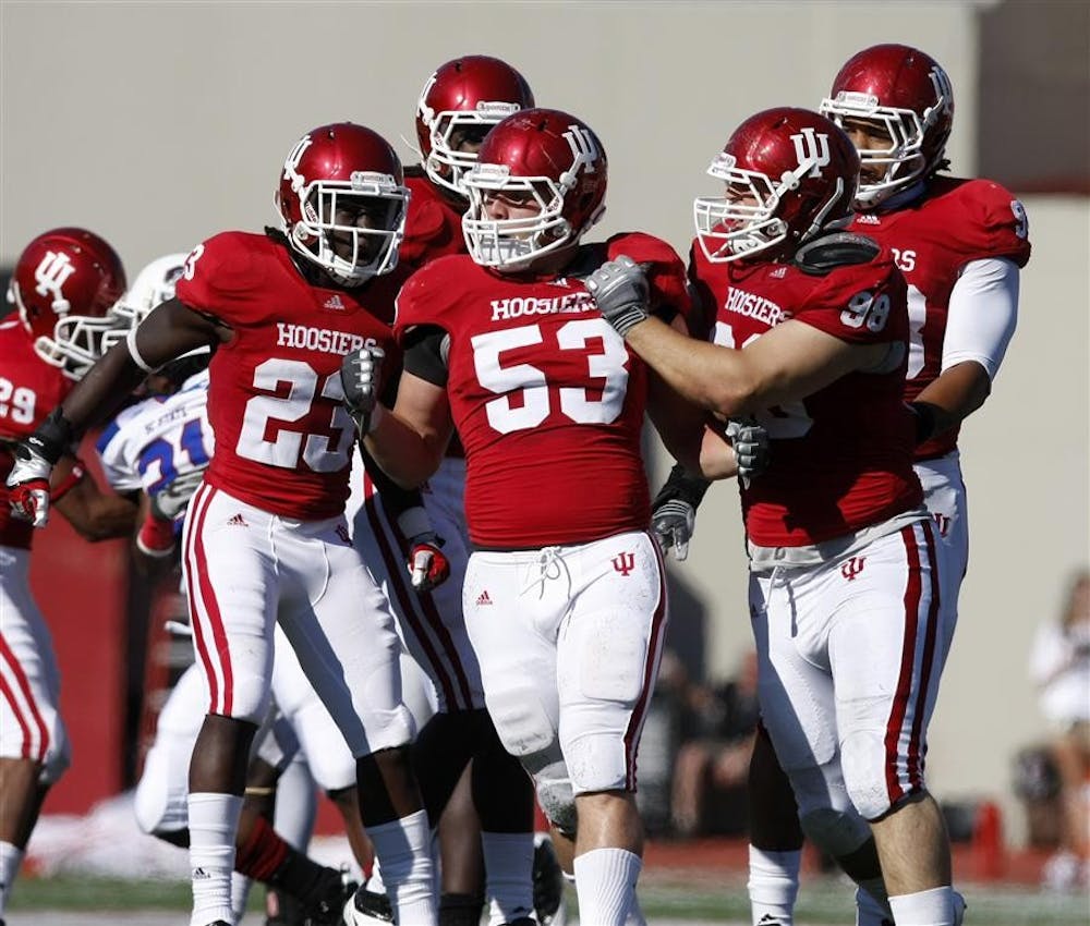 IU defenders celebrate after senior linebacker Jeff Thomas makes a play Saturday at Memorial Stadium.