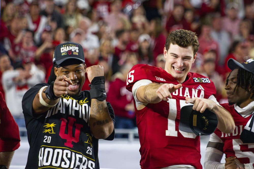 Redshirt senior defensive lineman Mikail Kamara (left) and redshirt junior quarterback Fernando Mendoza (right) point to the camera following their national championship win over Miami on Jan. 19, 2026, at Hard Rock Stadium in Miami Gardens, Florida. The pair were named the defensive and offensive players of the game.