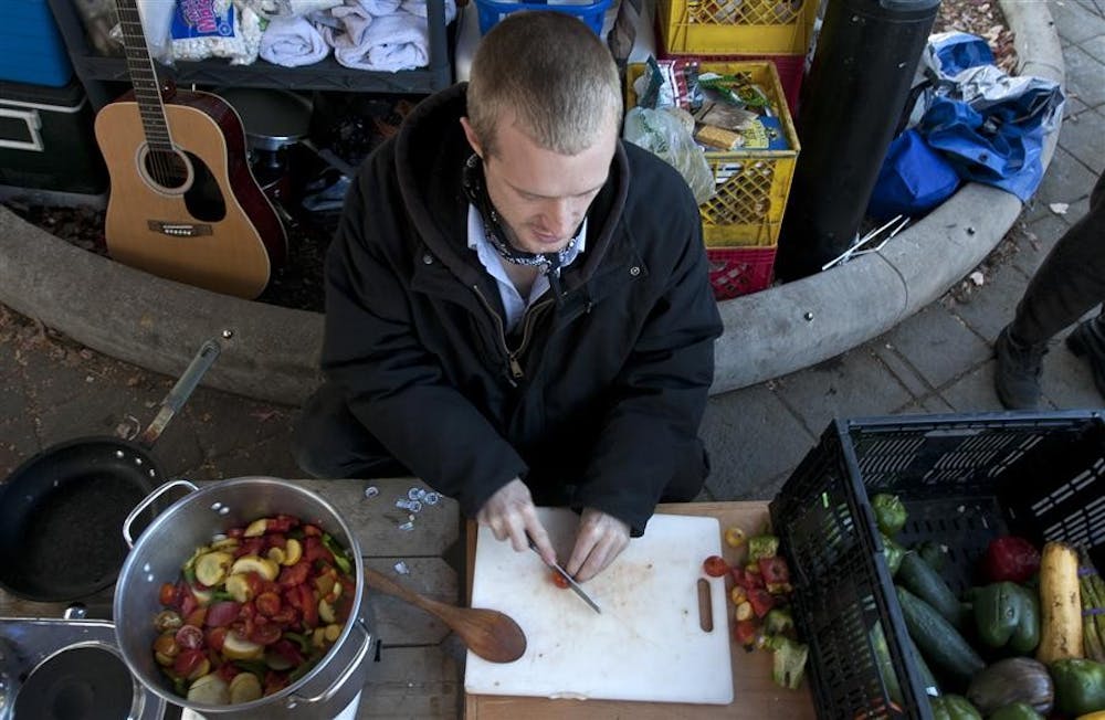 Blane prepares a vegetable dish Saturday in People's Park. Blane is the chef for "People's Cafe" and said there have been generous produce donations given to help feed Occupy Bloomington protesters. Mark Felix