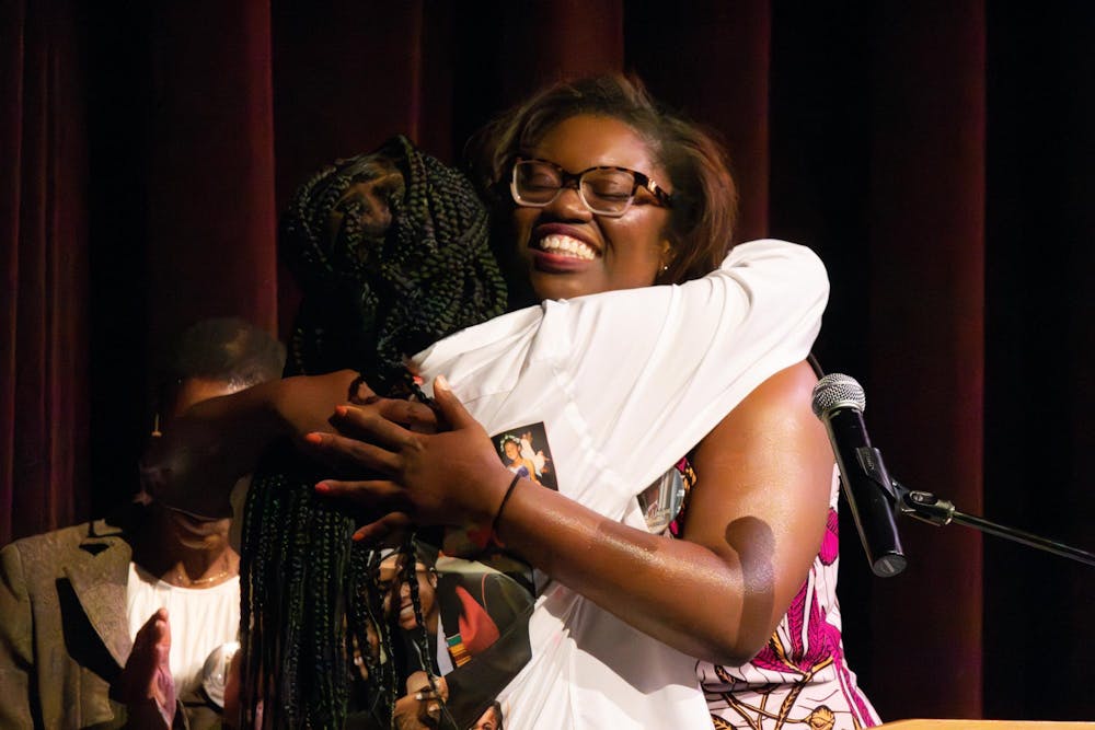 Director Gloria Howell hugs former Neal-Marshall student Dasani Cleveland's mother at the pinning ceremony Sept. 19, 2025, at the Ruth N. Halls Theatre in Bloomington. In memory of Cleveland, this year's Neal-Marshall Black Culture Center Leadership Academy is named the "Dasani Cleveland Class."