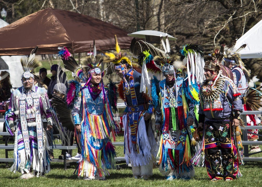 Native American dancers finish the first session of dancing at the IU 7th Annual Traditional Powwow in Dunn Meadow on Saturday. Dancers and audience members participated in festivities throughout the day. Matt Begala
