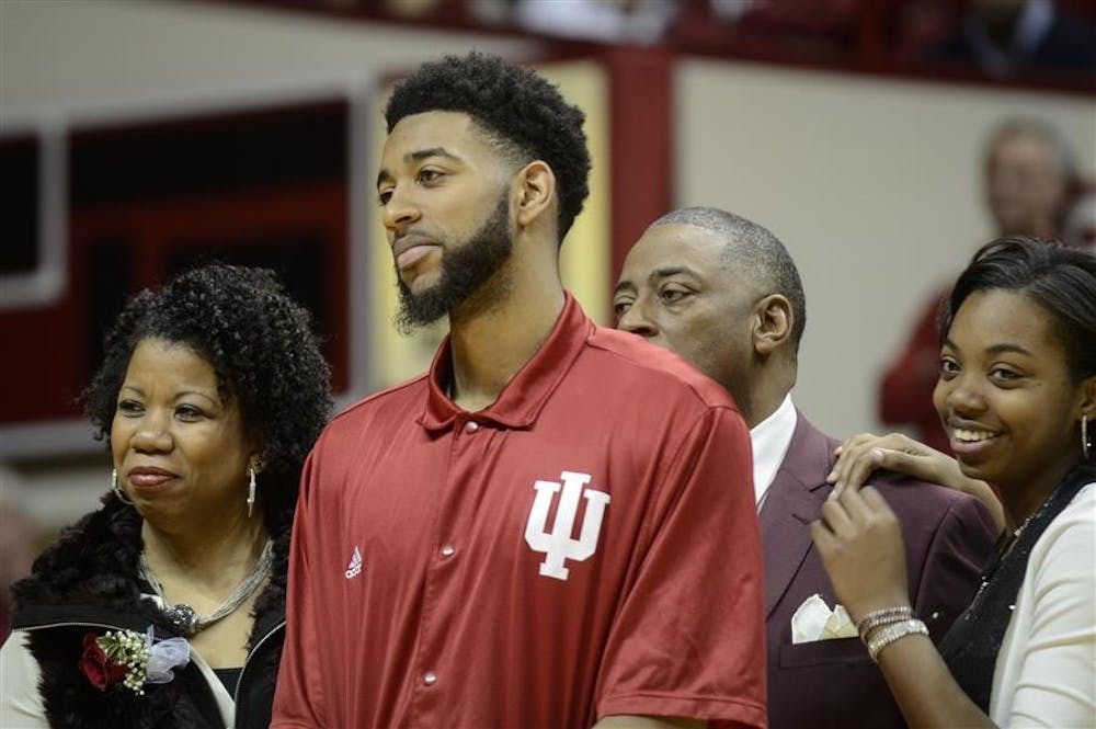 Senior Christian Watford stands with his family during senior night on Mar. 5 at Assembly Hall.