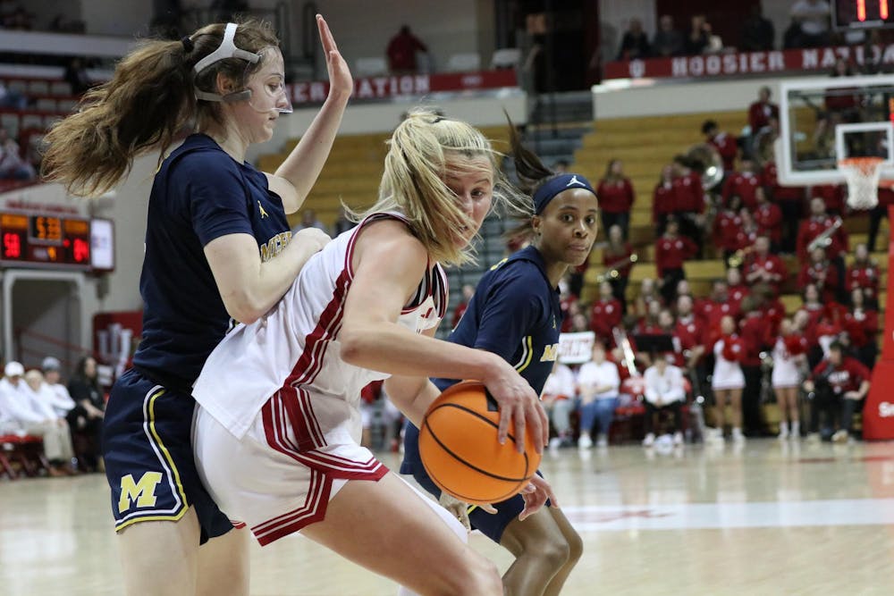Redshirt sophomore guard Lenée Beaumont pivots against a Michigan defender during the game Jan. 29, 2026, at Simon Skjodt Assembly Hall in Bloomington. Beaumont led the team with seven rebounds. Trinity Mackenzie