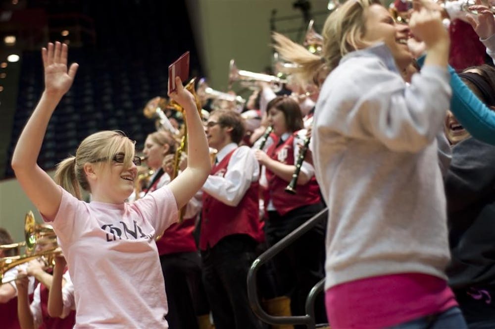 Senior Mariel Yohe celebrates after winning a layup competition during a timeout during IU's 67-62 win over No. 4 Ohio State Jan. 31 at Assembly Hall. Peter Stevenson