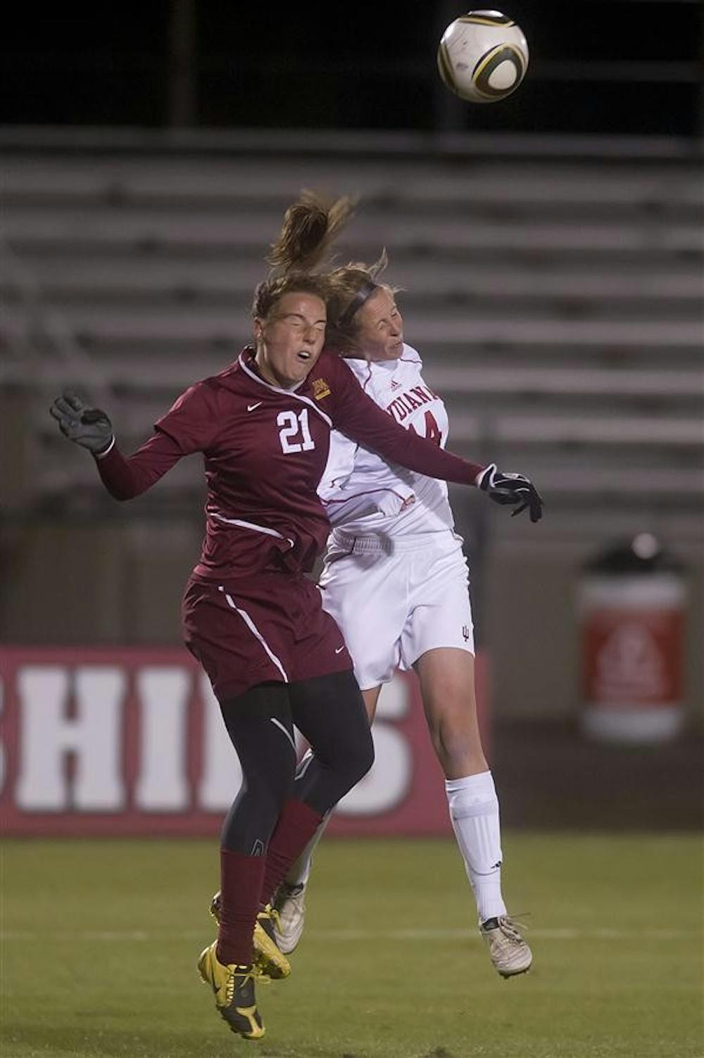 Junior midfielder Devon Beach challenges for a header during IU's 3-0 loss to Minnesota on Friday at Bill Armstrong Stadium.