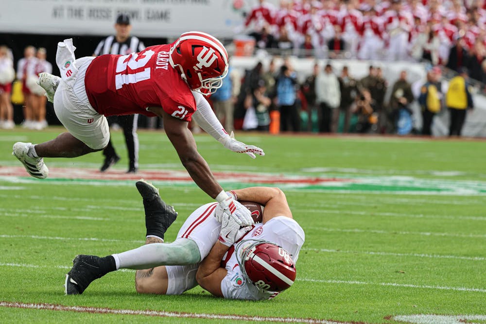 Sophomore linebacker Rolijah Hardy tackles Alabama redshirt senior tight end Josh Cuevas during the CFP quarterfinal game against Alabama on Jan. 1, 2026, at the Rose Bowl Stadium in Pasadena, California. Hardy had six total tackles in the game.