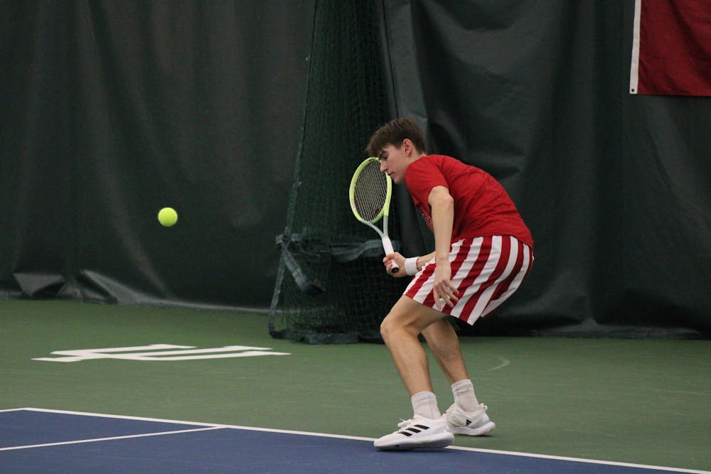 Reshirt freshman Facundo Yunis goes low to return a hit against Brown University's Noah Kernandez on Feb. 10, 2024, at the IU Tennis Center in Bloomington. Indiana defeated Brown 7-0.
