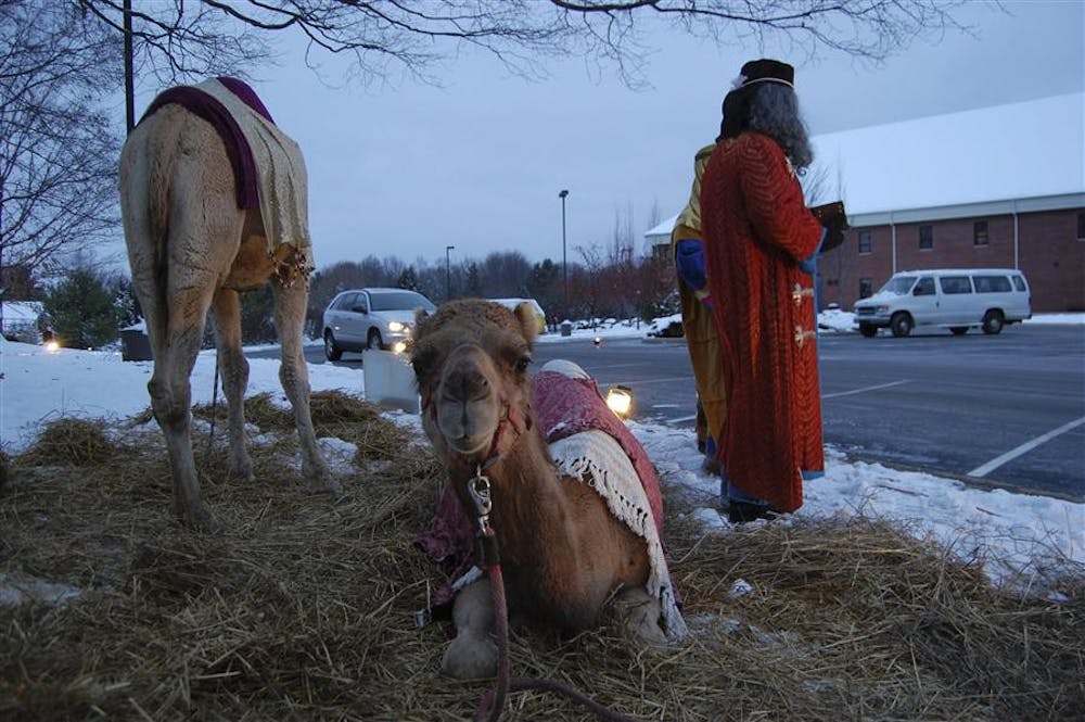 A camel takes a break with three wise men at the Sherwood Oaks Christian Church. The scene was part of a live, drive-thorough nativity that featured scenes from the Bible. Charles Scudder