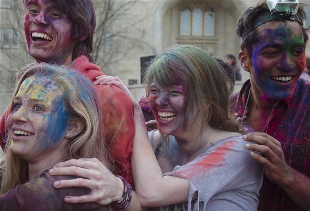 Students laugh while dancing in a circle as they celebrate Holi on Wednesday evening at the Collins Living-Learning Center courtyard. Holi is a Hindu festival, in which observers celebrate the beginning of spring by throwing multi-colored paint powder on one another.