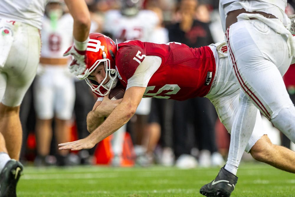 Redshirt junior quarterback Fernando Mendoza falls with the football during the CFP quarterfinal game against Alabama on Jan. 1, 2026, at the Rose Bowl Stadium in Pasadena, California. Mendoza had 16 rushing yards in the game.