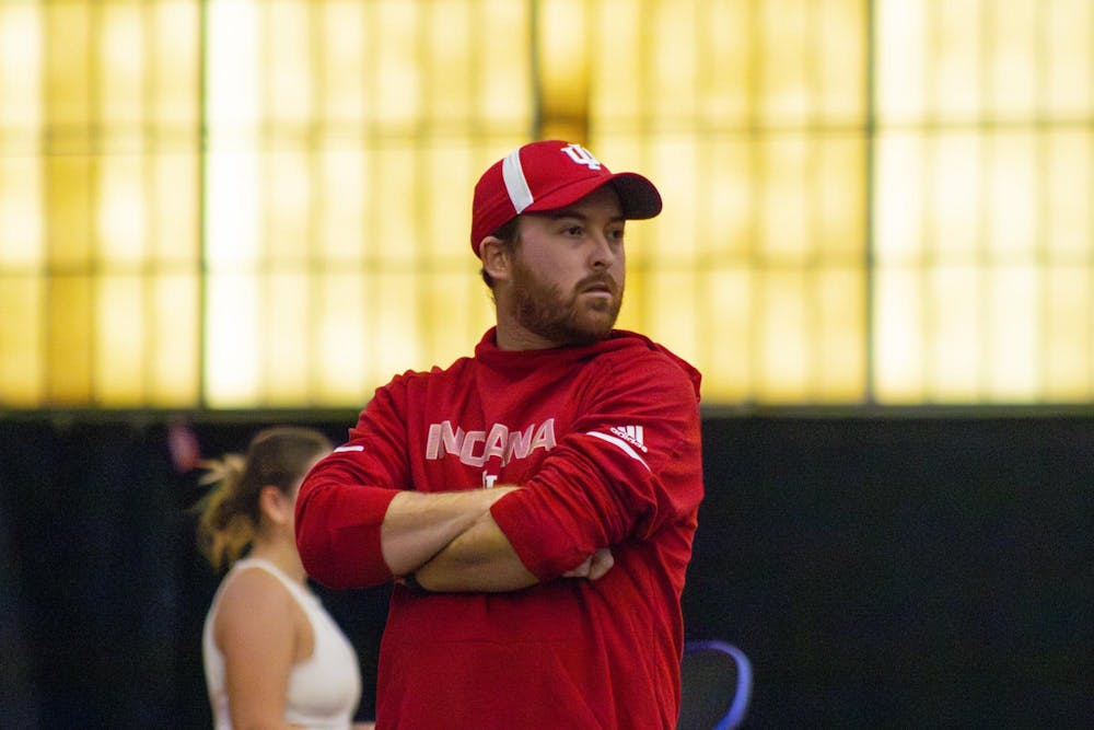 Indiana assistant coach Chase Colton looks toward the court during the match against the University of Cincinnati on Jan. 31, 2026, at the IU Tennis Center in Bloomington. Indiana defeated Cincinnati in the match. Jimmy Rush