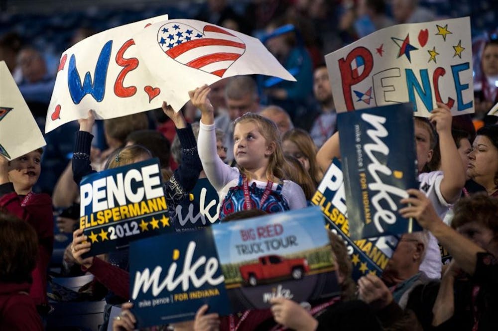 Mike Pence supporters hold signs as they wait for him to appear Tuesday at the Lucas Oil Stadium. Mark Felix