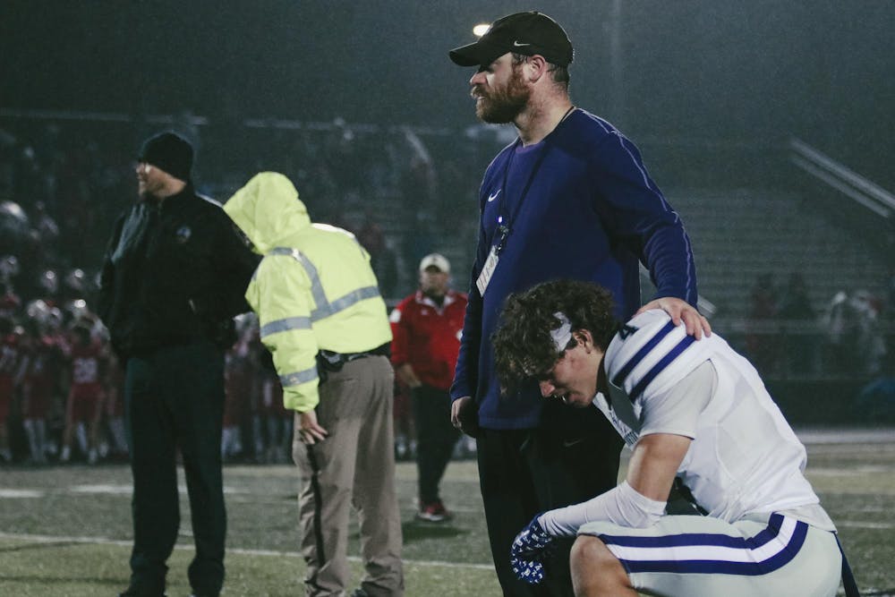 Senior Liam Moore sits with one of his coaches after the game against New Palestine on Nov. 21, 2025, at Kelso Stadium in New Palestine, Indiana. The loss ended the Panthers' season.