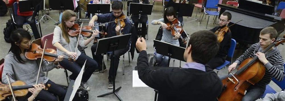 Graduate student Nicholas Hersh conducts orchestra members Sunday in the Music Annex. Steph Langan