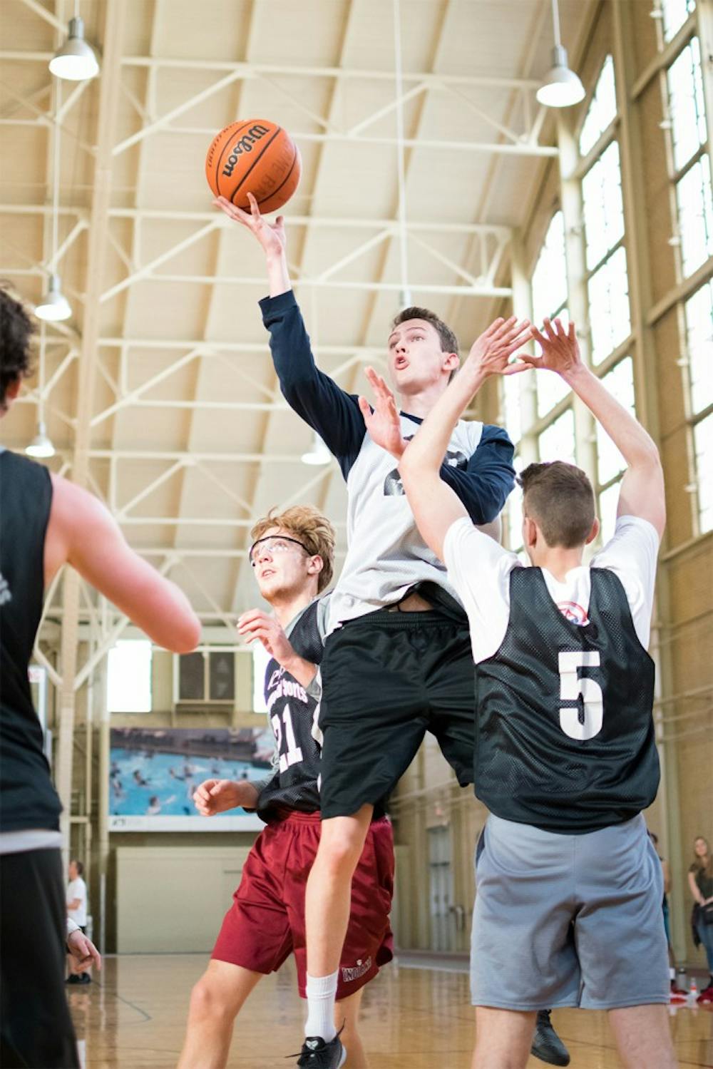 Scott Olshaker, white, goes for a layup against Graham Cenko, 21, and James Blodgett, 5, at the WIC during an IFC intramural game Friday. Olshaker's Phi Delt Platinum beat Cenko and Blodgetts' Phi Sig Silver with a final score of 68-31.