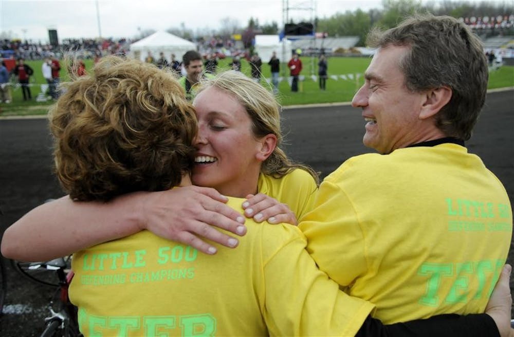 Teter senior Caitlin Van Kooten hugs her parents, Mary and Rick, after winning the women's Little 500 on Friday at Bill Armstrong Stadium. Van Kooten's team won the race for the second year in a row. Alex Farris