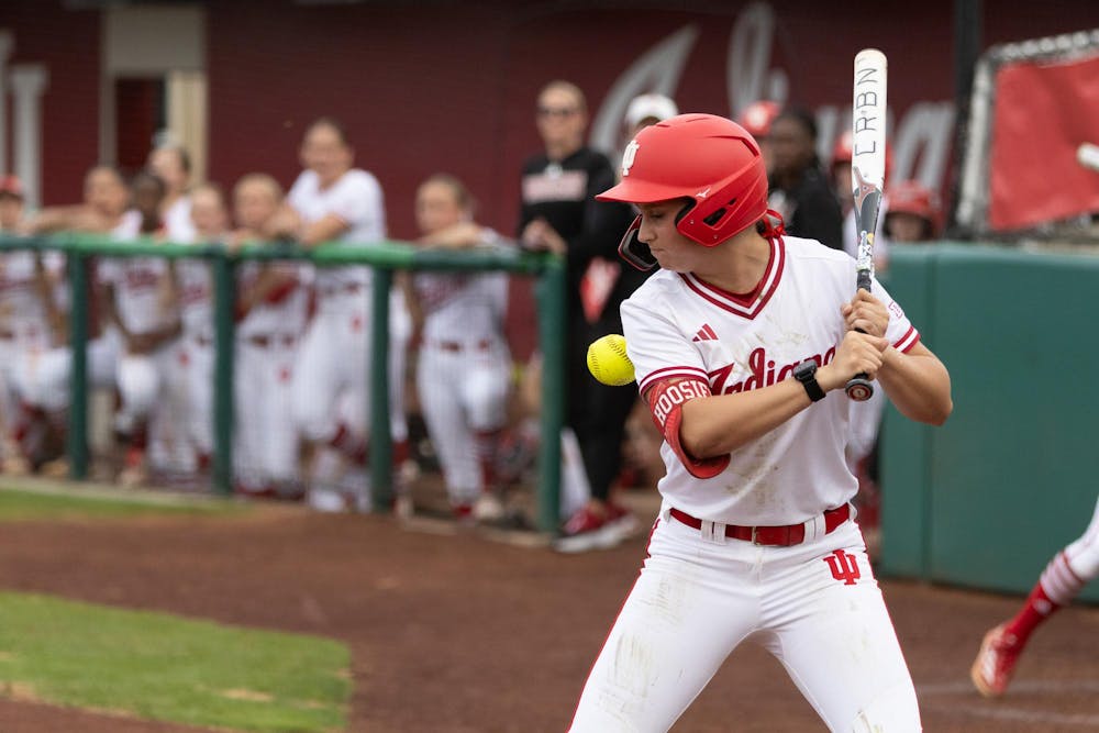 Sophomore outfielder Hannah Haberstroh gets hit by a pitch during the game against Loyola Chicago on March 10, 2026, at Andy Mohr Field in Bloomington. Haberstroh advanced to first and walked in a run.