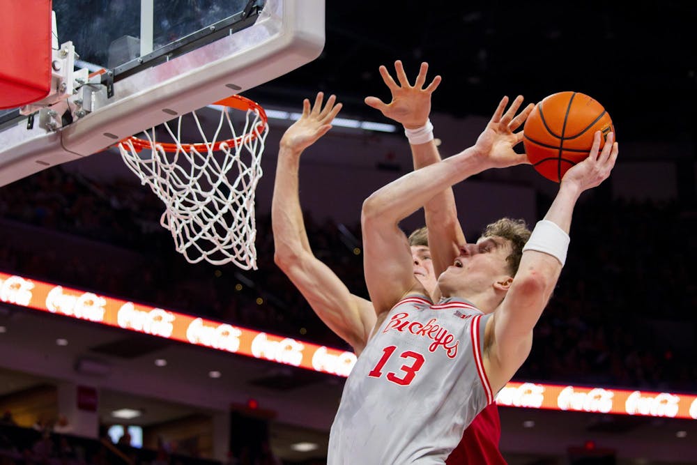 Ohio State senior center Christoph Tilly attempts a shot at the basket during the game between Indiana and the Buckeyes on March 7, 2026, at the Jerome Schottenstein Center in Columbus, Ohio. Tilly had seven points in the game.