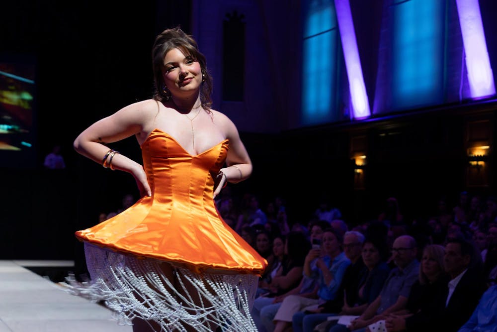 Emilia Cordon poses with her hands at her sides during the IU Fashion Design B.A. Fashion Show on April 9, 2026, in Alumni Hall at the Indiana Memorial Union in Bloomington. Cordon was the second to walk the runway for this collection.