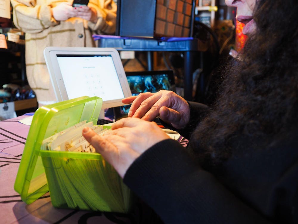 Mama Mo sifts through a box of recipe cards Feb. 7, 2026, at The Voodoo Shop at 920 N. Maple St. in Bloomington. The recipes came from her grandmother. Annabel Prokopy