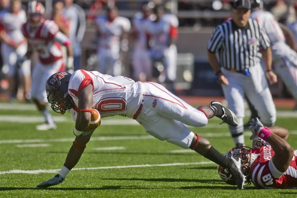 Arkansas State wide receiver Anthony Robinson stumbles after being hit by Indiana's Leon Beckum during IU's game against the Red Wolves on Saturday at Memorial Stadium. Peter Stevenson