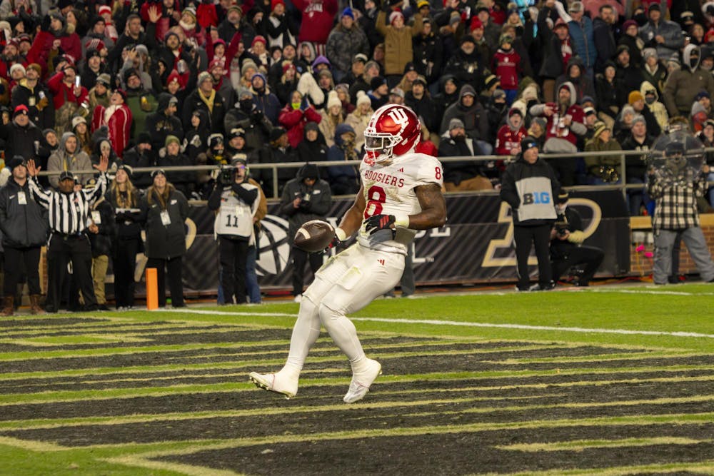 Redshirt senior running back Kaelon Black runs into the end zone during the game against Purdue on Nov. 28, 2025, at Ross-Ade Stadium in West Lafayette, Indiana. Black scored two touchdowns in the game.