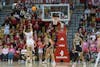 Junior forward Edessa Noyan shoots the ball in the game against Purdue on Feb. 8, 2026, at Simon Skjodt Assembly Hall in Bloomington. Noyan scored 12 points.