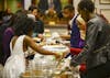 Senior Dee Zinnah chooses from traditional African dishes such as Ethiopian-Eritrean Injera, West African Jollof rice and Plantains during the Benefit Dinner Saturday evening in the Willkie Auditorium. The annual event was hosted by the African Students’ Association in collaboration with Alpha Phi Alpha fraternity and Alpha Kappa Alpha sorority to raise money for Freetown, Sierra Leone, with World Hope International after the city suffered heavy flooding and mudslides in August.