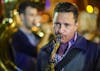 Saxophonist Greg Squared of the Raya Brass Band helps lead the Festival Parade during the Lotus World Music and Arts Festival Saturday night from 7th Street and Washington Street to Buskirk-Chumley Theater. Festival attendees were free to join the Brooklyn-based, Balkan brass band with an assortment of colored flags as they marched the streets of Bloomington.