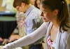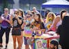 Wells Library employee Justen Warne assists students in the making of custom buttons during the First Thursdays event Thursday evening in the Fine Arts Plaza. The monthly festival aims to bring the community together with live music, food and the arts.
