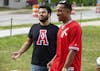 Kappa Alpha Psi brothers Grant Prather, senior, and Tate Spence, junior, play a game of water pong during IU National Pan-Hellenic Council fair on Saturday afternoon in Dunn Meadow. Members from various NPHC chapters came together to celebrate and reach new students interested in joining greek life.