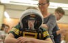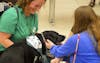 Students can't help but play with Barney during the Destress Fest hosted Wednesday evening in the Wells Library Commons.