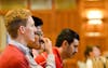 The Interfraternity Council adopts fake mustaches in support of Movember founder Adam Garone and his presentation on the Movember Foundation Friday evening in Alumni Hall.