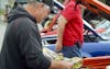 Spencer resident Tab Koontz flips through his restoration book during the 3rd Annual Classic Hot Rod Show Sunday afternoon outside of the Monroe County History Center. Koontz documented the entire restoration of his Challenger from 2010 and featured décor matching the “Tigger” (Winnie the Pooh) inspired color scheme.