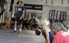 Hoosier Crossfit owner Shaun Tieman hypes Bloomington residents up for Crossfit with a cop Saturday morning. Officers from both the Bloomington Police Department and the Indiana University Police Department came out to bond with citizens and IU students through intensive crossfit exercises.
