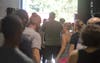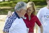 Bloomington Commander of Veteran’s Foreign Wars Joe Hardin and Congressional Candidate Shelli Yoder share greetings during the Democrat Picnic Sunday evening at Bryan Park. The event hosted families of Bloomington and democratic candidates with promises of free food and live entertainment.