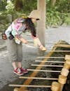 A visitor to a Shinto shrine in Osaka, Japan, washes her hands in a stone wash basin at the shrine’s entrance in preparation for prayer.