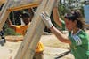 Junior Michael Coleman, Recording Secretary of Alpha Phi Alpha, and sophomore Jenn Horwitz of Alpha Gamma Delta work together Saturday afternoon while helping to build a house for Habitat For Humanity.
