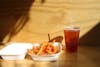 A side order of sweet potato fries with an iced tea from the Owlery sits in the sun Monday. Sweet potato fries are one of the items you can get as part of the Owlery’s Devour Bloomington take-out menu.