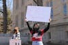 IU seniors Jazmin Hernandez, Anna Song, Arianna Lagunas and Jelena Nguyen hold signs Wednesday at the Sample Gates during the Gathering Against Asian Hate organized by the Indiana Graduate Workers Coalition. Organizers held a moment silence in remembrance of the Atlanta shooting victims.