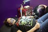 Tattoo artist Kae Hutchens gives a tattoo to Kava Seek on Feb. 23 at Crystal Moon Body Arts in Bloomington. Hutchens is the shop's tattoo artist and has been tattooing for 15 years.