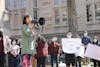Meloddy Gao, a senior studying environmental management, speaks to the crowd Wednesday at the Sample Gates, saying “hate and white supremacy need to go." Organizers of the Gathering Against Asian Hate held a moment silence in remembrance of the Atlanta shooting victims.