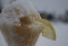 A pared-down amaretto sour, consisting of just the almond-flavored liqueur, and fresh lemon juice over snow is pictured.