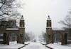 Snow flurries fall near the Sample Gates on Monday. Bloomington is expected to receive as much as a foot of snow between Monday afternoon and Tuesday morning.