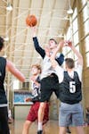 Scott Olshaker, white, goes for a layup against Graham Cenko, 21, and James Blodgett, 5, at the WIC during an IFC intramural game Friday. Olshaker's Phi Delt Platinum beat Cenko and Blodgetts' Phi Sig Silver with a final score of 68-31.