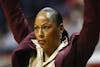 IU Women's Basketball Coach Felisha Legette-Jack lifts up her arms during IU's 61-60 loss to Illinois on Sunday at Assembly Hall.