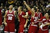 The Indiana bench erupts after Remy Abell hits a 3 pointer at the end of the game Saturday at Mackey Arena.