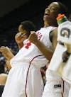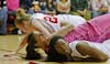 Senior forward Danilsa Andujar, left, and senior guard Alisha Goodwin run into an Illinois defender after going for a rebound during IU's 61-60 loss to Illinois on Sunday at Assembly Hall.