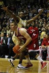 Indiana guard Jordan Hulls tries to get past Purdue defender Lewis Jackson Saturday at Mackey Arena.